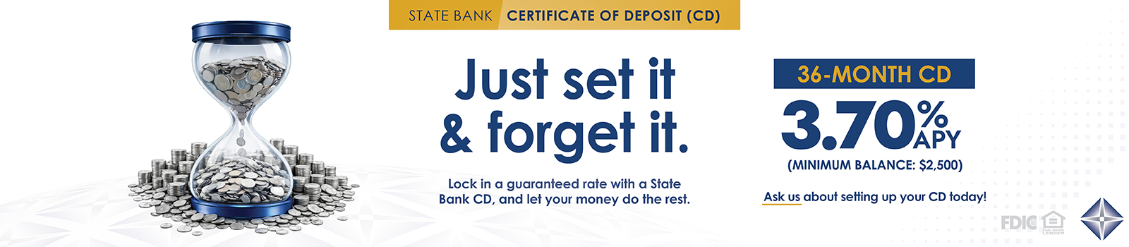 Your investment is safe because State Bank CDs are backed by the Federal Deposit Insurance Corporation for up to $250,000 per individual – making them as safe as any investment in the world.
